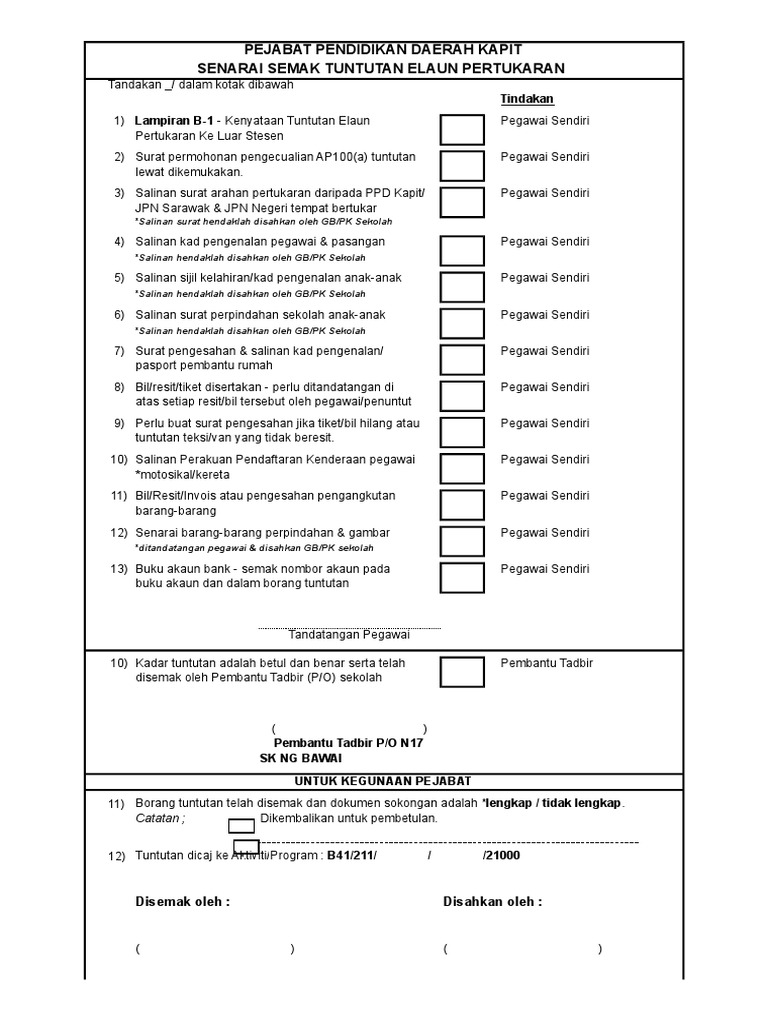 Lampiran c borang tuntutan elaun perjalanan dalam • sekiranya tuntutan lebih daripada bilangan ruangan. Soalan faq berkenaan dengan tuntutan elaun perjalanan bil soalan jawapan pekeliling berkaitan kelayakan elaun tindakan pembetulan. Surat arahan pertukaran/penempatan dari kkm yang lengkap. Borang tuntutan elaun perpindahan rumah yang telah. *diisi oleh pegawai yang layak membuat tuntutan perjalanan di bawah pp wp1.6.